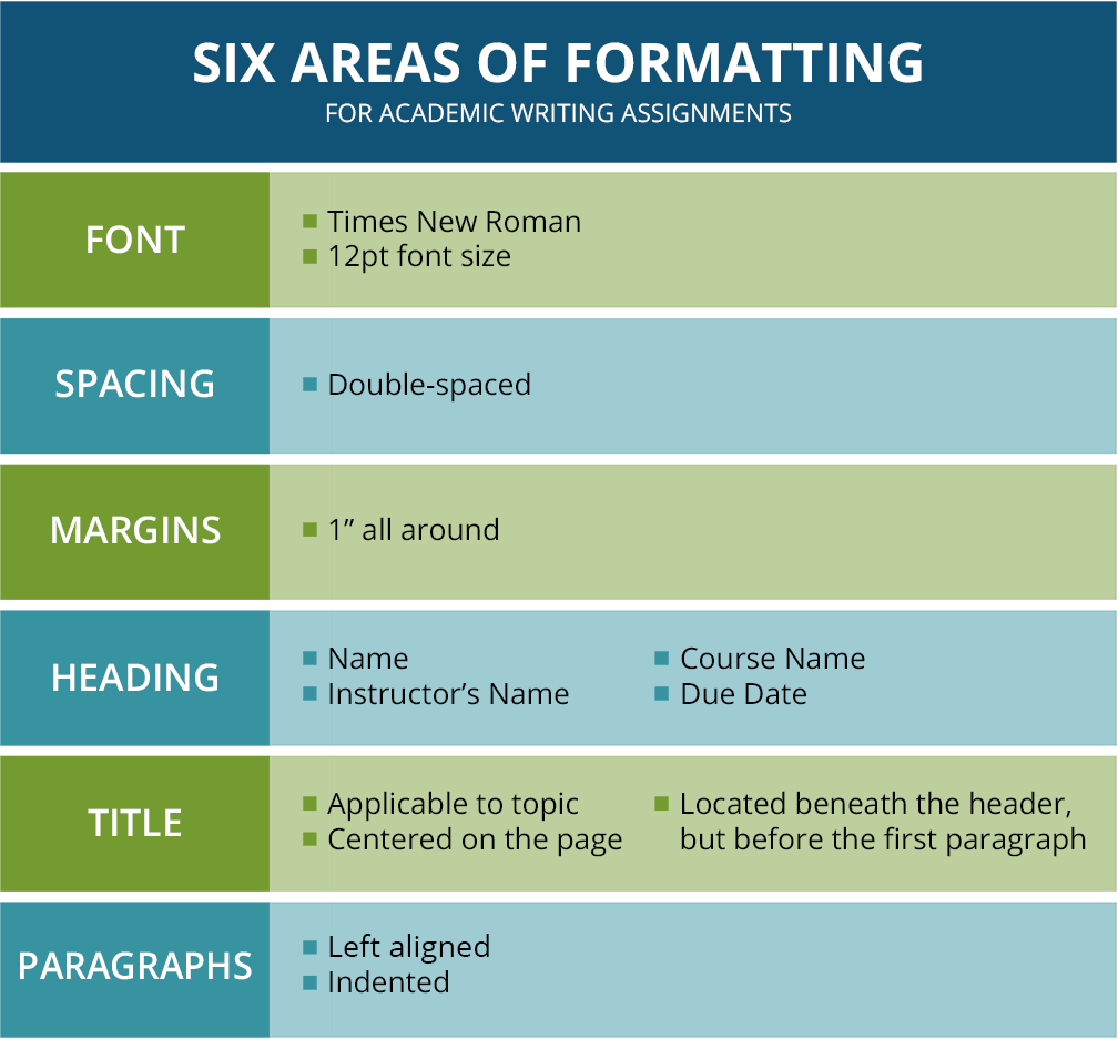 Just to review, the six areas of formatting you will need to apply to your academic writing assignments (such as the Informative Essay) throughout this course are: